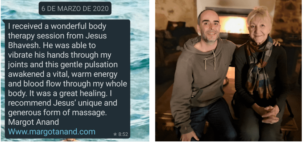 Margot Anand: Recibí una maravillosa sesión de terapia corporal de parte de Jesús Bhavesh. Pudo hacer vibrar sus manos a través de mis articulaciones. Esta suave pulsación despertó una energía vital y cálida y un flujo de sangre a través de todo mi cuerpo. Fue una gran curación. Recomiendo la forma única y generosa de masaje de Jesús.